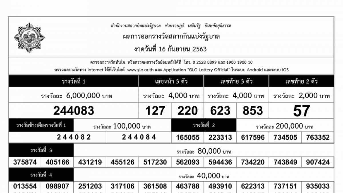 ตรวจผลสลากกินแบ่งรัฐบาล งวดประจำวันที่ 16 กันยายน 2563 รางวัลละ 6,000,000 บาท 244083.